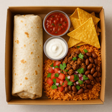 - Burrito with Mexican spiced chicken, kidney beans, spiced potato, pico de gallo, salsa and cheese, chocolate brownie + 250mL sparkling water